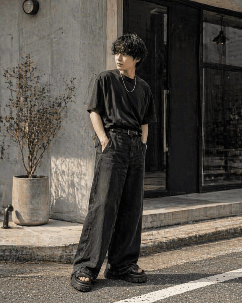 存在感が結構あるので、写真のようなフルレングスのワイドパンツと合わせることでサンダルの主張を抑えることができ、非常に綺麗なスタイルに。